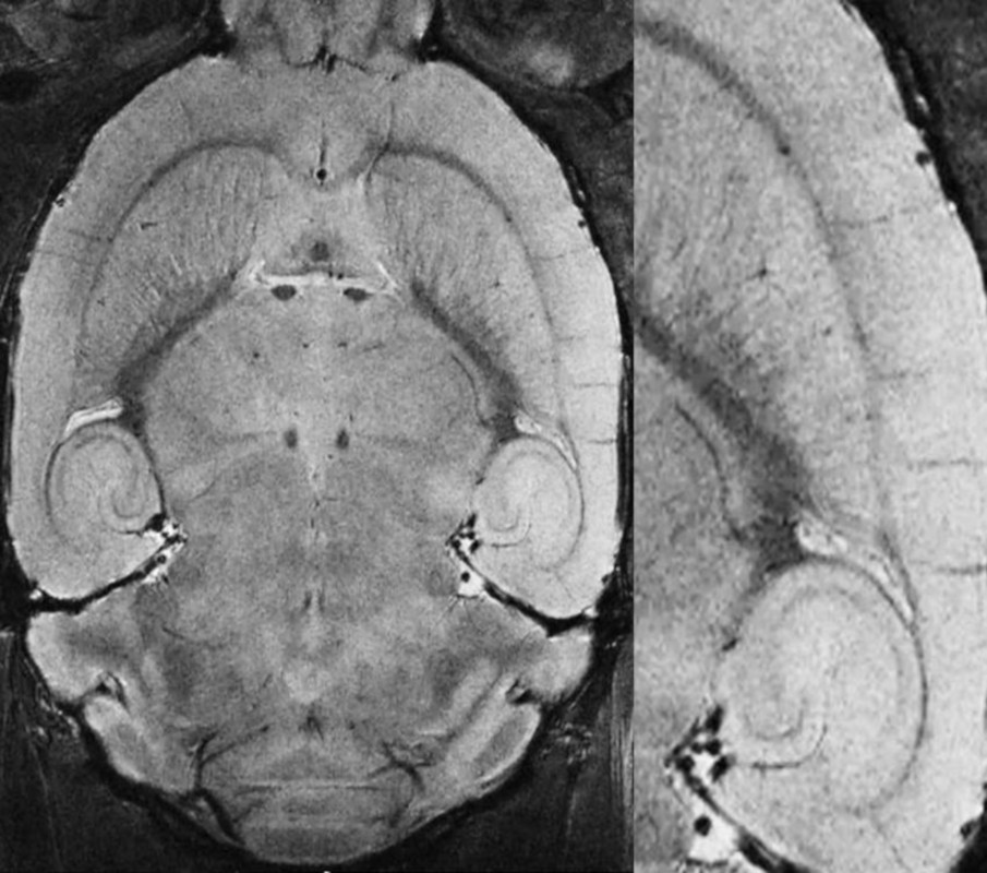活体小鼠大脑,分辨率为29µm,用MRI CryoProbe在15.2 T下测量。采集细节:RARE,分辨率:(29 × 29 × 200)µm³,TR: 3.5 s, TE: 25 ms,回波:6,切片:7